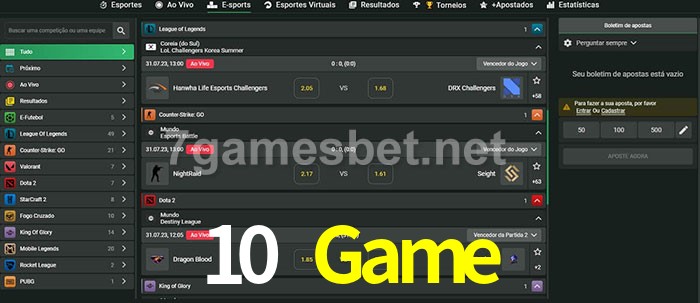 O 10 Game oferece uma grande seleção de opções de apostas em e-sports com probabilidades competitivas